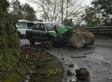 MISANTLA, Ver.– Un impactante incidente se registró la tarde de este jueves en la carretera de la sierra Misantla–Xalapa, donde una roca de grandes dimensiones se desprendió de