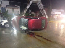 Martínez de la Torre, Ver. Femenina que conducía un automóvil Honda Civic de color guinda, impacta vehículos estacionados y termina volcado sobre el pavimento. El accidente ocurrió el