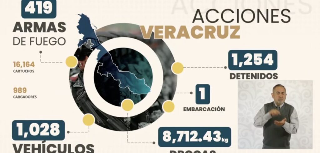 En apoyo a las acciones implementadas por la Gobernadora Roció Nahle García y derivado del reforzamiento de acciones coordinadas en Veracruz, por instrucción de la presidenta Claudia Sheinbaum, se logró la detención de mil 254 personas, el aseguramiento de ocho toneladas de droga, 400 armas de fuego, mil 028 vehículos y una embarcación.