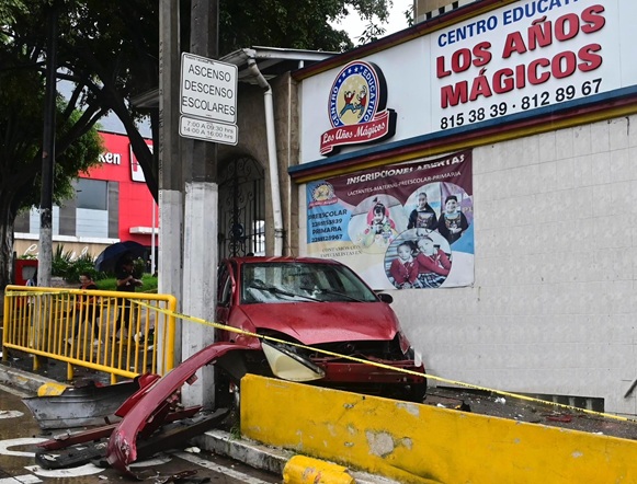XALAPA, Ver.- Lo que pudo resultar en una tragedia terminó con un conductor policontundido luego de incrusta su automóvil entre poste y una guardería llamada “Los Años Mágicos” ubicada en la avenida Lázaro Cárdenas de esta capital.
