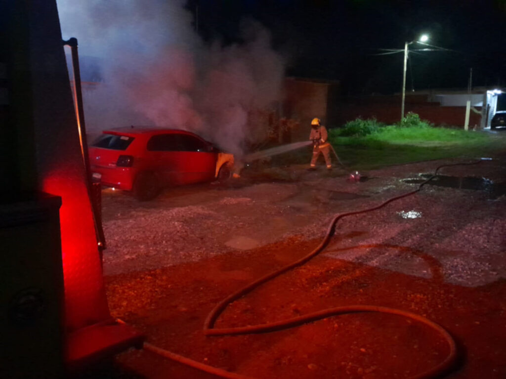 Envuelto en llamas, se vio un automóvil Volkswagen de la línea Gol, de color rojo, bomberos acuden la madrugada del viernes a sofocar el incendio.