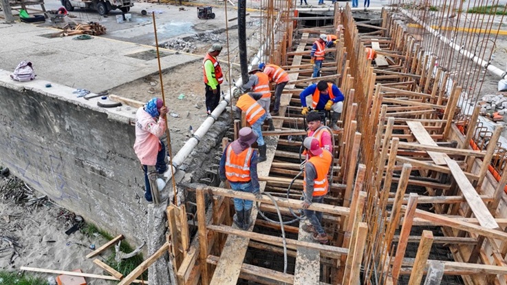 La obra de rehabilitación del drenaje pluvial, mediante la construcción de un canal sobre el malecón costero registra un avance del 30 por ciento. Este viernes, se realizó el suministro y vaciado de 49 metros cúbicos de concreto premezclado, especialmente formulado para resistir sulfatos y ambientes marinos.