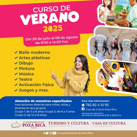 El Ayuntamiento de Poza Rica, a través de la Casa de Cultura, invita a niñas, niños y jóvenes a disfrutar de los Cursos de Verano 2025, una experiencia diseñada para despertar la creatividad, fortalecer habilidades y aprovechar al máximo las vacaciones escolares.