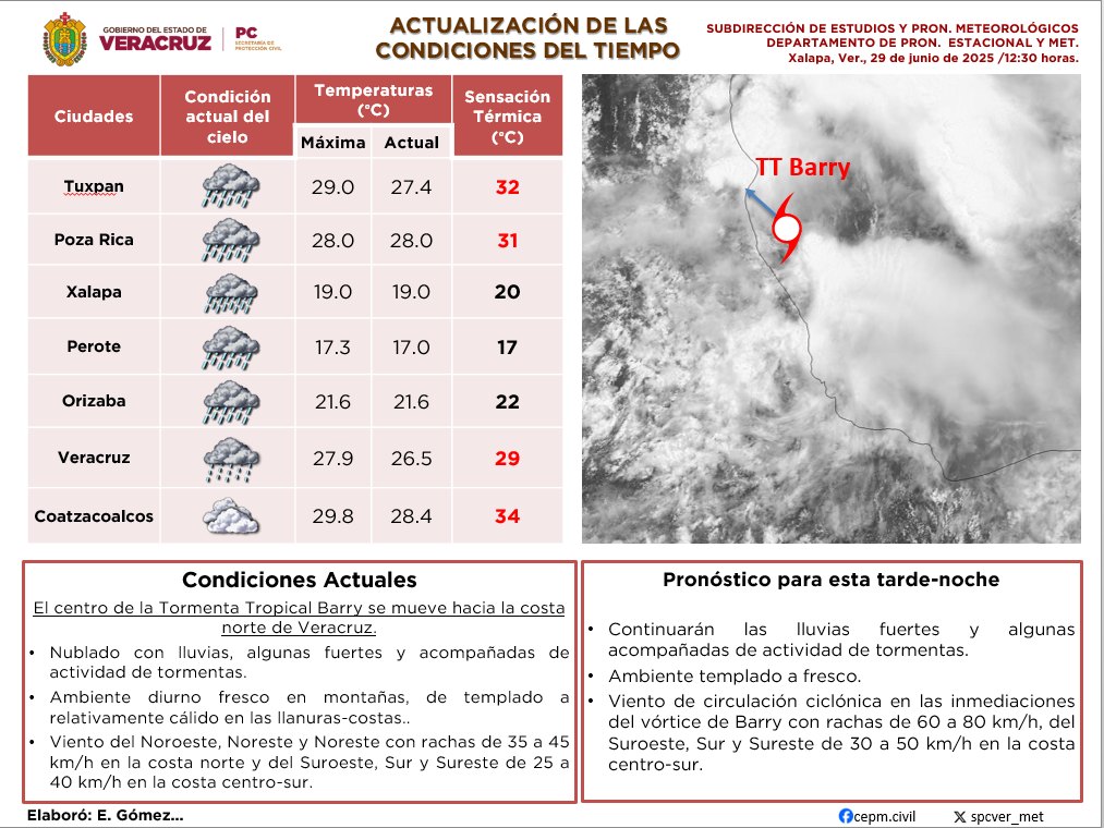 A las 12:30 PM el CEEC de Protección Civil pidió a la ciudadanía extremar precauciones: “El centro de la tormenta tropical #Barry se mueve hacia la costa norte de Veracruz, donde podría impactar durante esta tarde, por lo tanto, se mantendrán las lluvias de intensidad variable, moderadas a fuertes y algunas tormentas. Extreme precauciones”.
