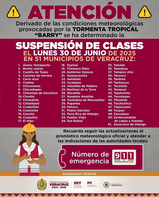 Debido a los efectos de la tormenta tropical “Barry”, el Gobierno del Estado de Veracruz, a través de la Secretaría de Educación (SEV) y Protección Civil (PC), informa la suspensión de clases en los turnos matutino y vespertino en los siguientes 51 municipios del estado: