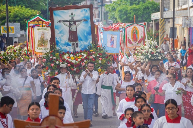 La feligresía católica de Cosoleacaque recorrió las principales avenidas de la ciudad, con la imagen de la Preciosa Sangre de Cristo en el tradicional paseo de flores al que asistió el presidente municipal, Ponciano Vázquez Parissi.