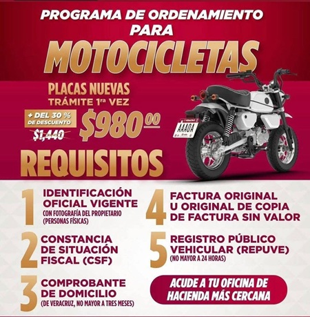 De acuerdo con la Secretaría de Finanzas y Planeación del Estado de Veracruz inició el programa de ordenamiento para motocicletas en todas la Oficinas de Hacienda.
