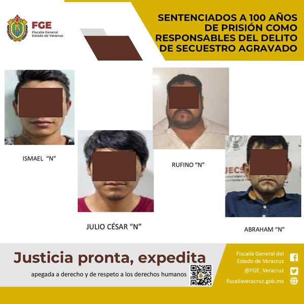La Fiscalía General del Estado informa que, la Unidad Especializada en Combate al Secuestro logró sentencia condenatoria de 100 años de prisión en contra de Ismael “N”, Julio César “N”, Rufino “N” y Abraham “N”, como responsables del delito de secuestro agravado.