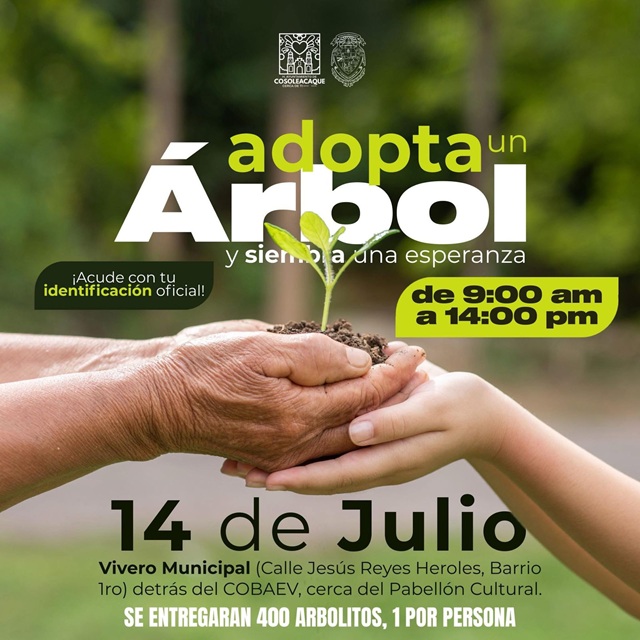H. Ayuntamiento de Cosoleacaque, invita a la ciudadanía a que acuda al vivero municipal que se encuentra frente a la rueda de la fortuna, este lunes 14 de junio, de 9 de la mañana a 2 de la tarde y adopte un árbol.