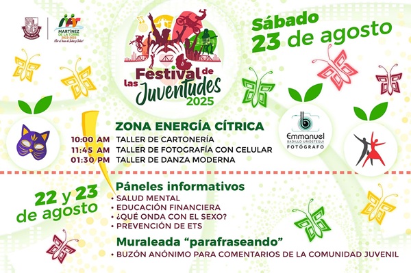 La Presidenta Municipal de Martínez de la Torre, Alfa Citlalli Álvarez Vázquez presentó ante los medios de comunicación el Festival de las Juventudes, evento que se celebrará del 22 al 24 de agosto, y que tiene como finalidad llevar estos espectáculos a los jóvenes con actividades culturales, de la cadena del limón persa, deportivas, artísticas y educativas, que tendrán como eventos estelares las presentaciones de Caloncho, La Dinastía y Uzielito.