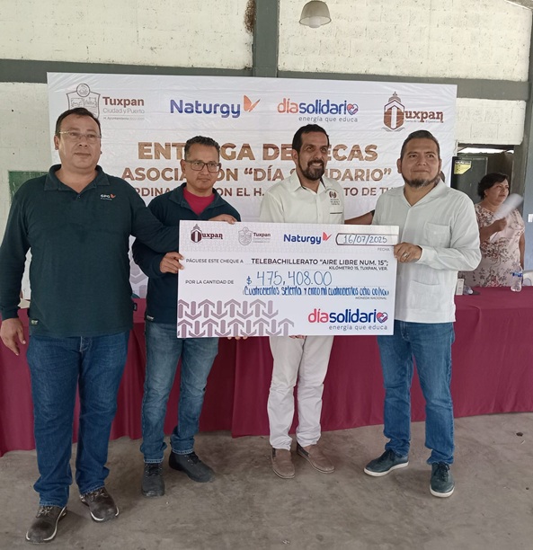 Se realizó la entrega de becas educativas de la “Asociación Día Solidario” de GPG Grupo Naturgy, en coordinación con el Ayuntamiento de Tuxpan, a estudiantes del Telebachillerato Aire Libre Km 15 y Becas Fuerza y Energía de Tuxpan (FET), a estudiantes de Países Bajos Km 8.