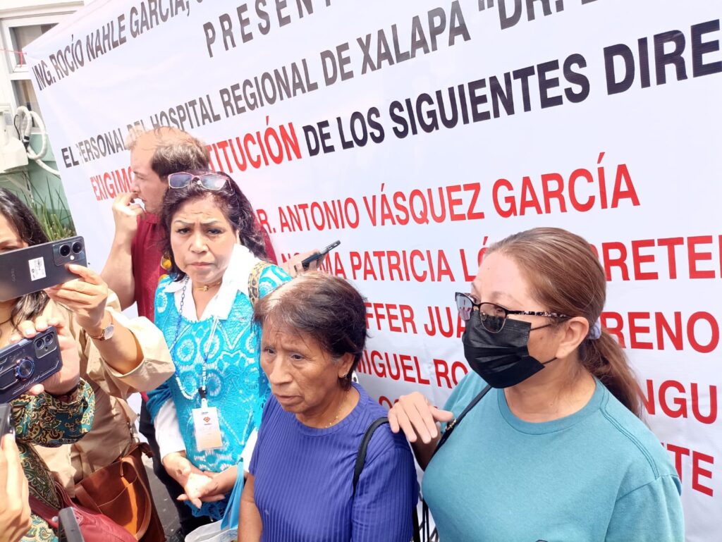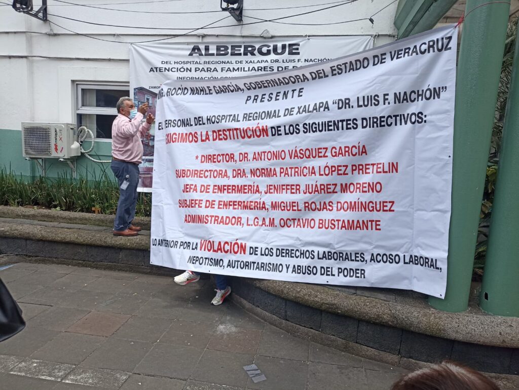 En una gran bambalina que fue colocada frente al citado hospital, las inconformes demandaron la destitución de los doctores Antonio Vázquez García y Norma Patricia López Pretelín, director y subdirector, respectivamente, así como a la jefa y subjefe de Enfermeras, Jennifer Juárez Moreno y Miguel Rojas Domínguez, y al administrador, Octavio Bustamante.