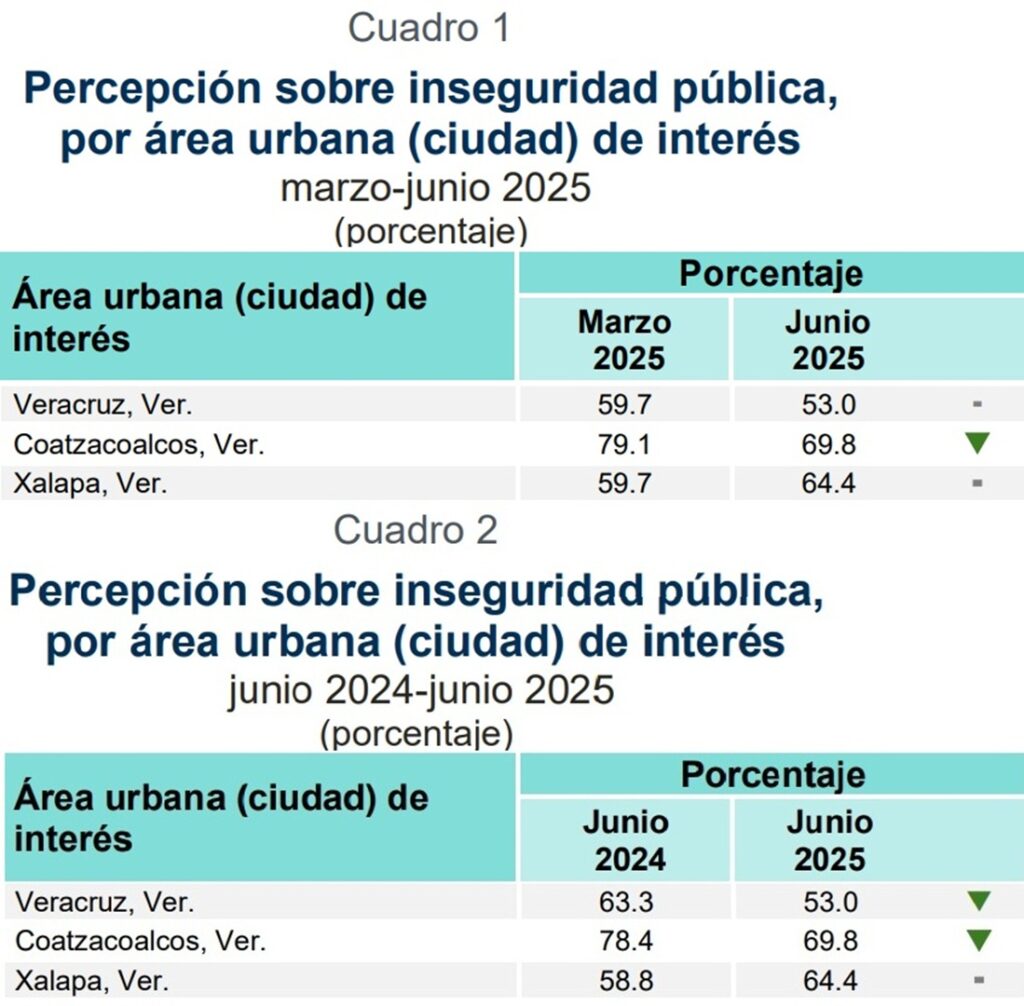 En el apartado Percepción sobre inseguridad pública, por área urbana (ciudad) de interés de marzo 2025 – junio 2025; el puerto de Veracruz, disminuyó de 59.7% a 53.0%; el puerto de Coatzacoalcos, también disminuyó de 79.1% a 69.8% y para la Capital Xalapa, aumentó de 59.7% a 64.4%.