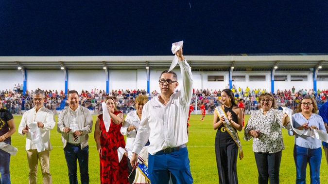 El presidente municipal Salvador Murrieta Moreno estuvo acompañado por la alcaldesa Alfa Citlali Álvarez Vázquez del municipio de Martínez de la Torre y Carlos García Domínguez de Atzalan, además Nimbe Paulette Indoval Castro, Luz Belén 1ra, reina infantil de Santiago, Mairym 1ra del Barrio de San Pedro y la joven Nimbe Paulette Indoval Castro quien será la próxima soberana de la feria Tlapacoyan 2025, quienes fueron parte de la pasión del fútbol.