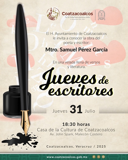 El Ayuntamiento de Coatzacoalcos, que preside Amado Cruz Malpica; invita a la presentación de la obra literaria del poeta y escritor Mtro. Samuel Pérez García en “Jueves de Escritores”.