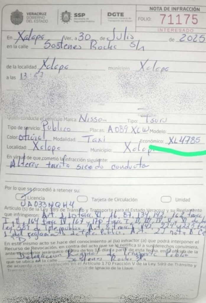 El primer caso documentado fue el de un conductor que cobró 140 pesos por un traslado de Plaza Américas al Hotel Xalapa, tarifa que supera considerablemente el rango permitido. La usuaria afectada presentó su queja ante Tránsito y Transporte Público, lo que derivó en un proceso inmediato contra el chofer y el concesionario de la unidad.
