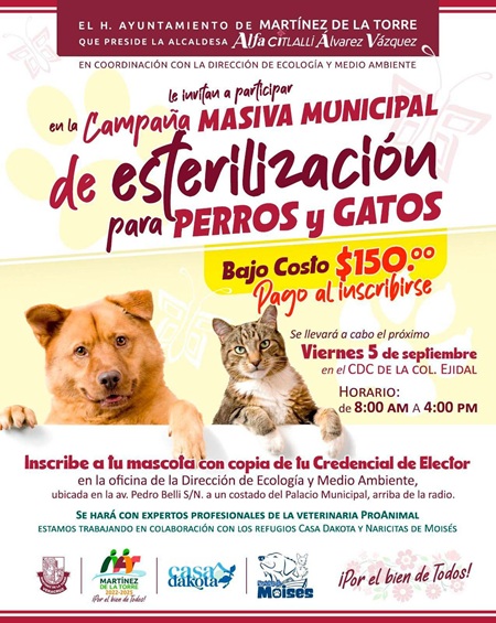 Tener mascotas es una gran responsabilidad, es por eso que el Gobierno de Martínez de la Torre que encabeza la Presidenta Municipal Alfa Citlalli Álvarez Vázquez en coordinación con la Dirección de Ecología prepara la Campaña Masiva de Esterilización de Perros y Gatos, la cual se llevará a cabo el próximo 5 de septiembre en el CDC de la Colonia Ejidal de 8 de la mañana a 4 de la tarde.