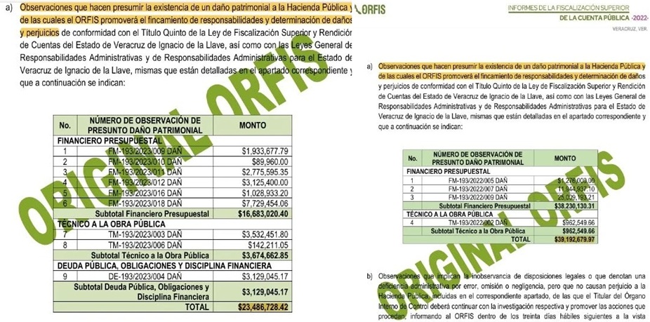 El ORFIS en la revisión de la cuenta pública 2022 del Ayuntamiento de Veracruz detectó un presunto daño patrimonial por $38 millones 200 mil pesos; así mismo, en la Cuenta Pública 2023, el ORFIS identificó un presunto daño patrimonial por 23 millones 486 mil 728 pesos con 42 centavos, distribuido entre irregularidades financieras presupuestales, técnicas en obra pública y asuntos relacionados con deuda pública y disciplina financiera.