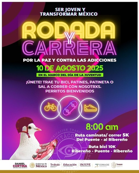 El Ayuntamiento de Tuxpan, a través de la Comisión Municipal del Deporte (COMUDE) y en colaboración con el Instituto Mexicano de la Juventud (IMJUVE), realizará el domingo 10 de agosto la Rodada y Carrera por la Paz y Contra las Adicciones, una jornada recreativa que forma parte de las actividades conmemorativas por el Día Mundial de la Juventud.
