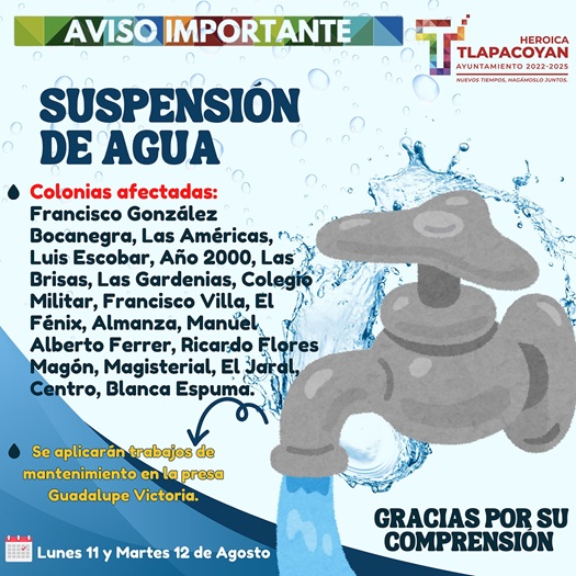 Las colonias que se verán afectadas en la suspensión del vital líquido son; Francisco González Boca Negra, Heroico Colegio Militar, José López Portillo, Las Américas, Las brisas, Zona Centro, Blanca Espuma, Las gardenias, Luis Escobar Toledano, año 2000, El Fénix, El Jaral, Francisco Villa, Magisterial, Manuel Alberto Ferrer y Corzo, Manuel Almanza.