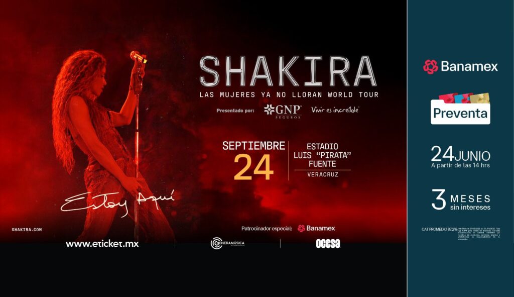 Los boletos ya están disponibles en www.eticket.mx, y puedes aprovechar 3 meses sin intereses con Banamex. No te pierdas la oportunidad de ver a Shakira en vivo y en directo en Veracruz.