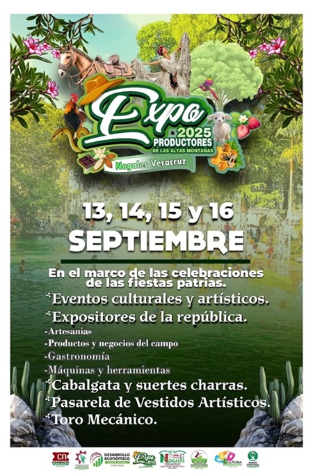 Añadió que en el marco de las Fiestas Patrias, la Expo Productores, contará los días 13, 14, 15 y 16 de septiembre, con eventos culturales y artísticos, artesanías, productos y negocios del campo, gastronomía, máquinas y herramientas, cabalgata y suertes charras, pasarela de vestidos artísticos y toro mecánico.