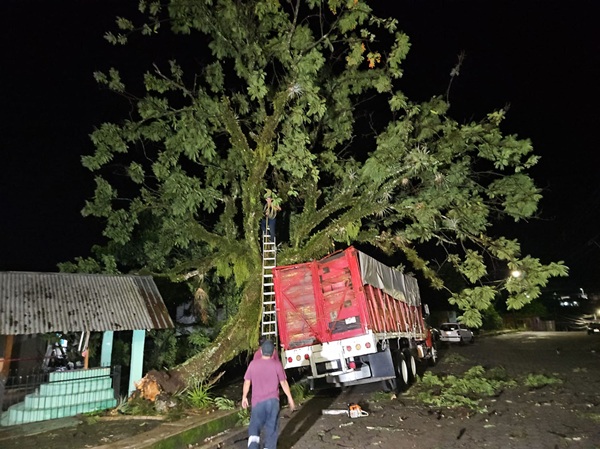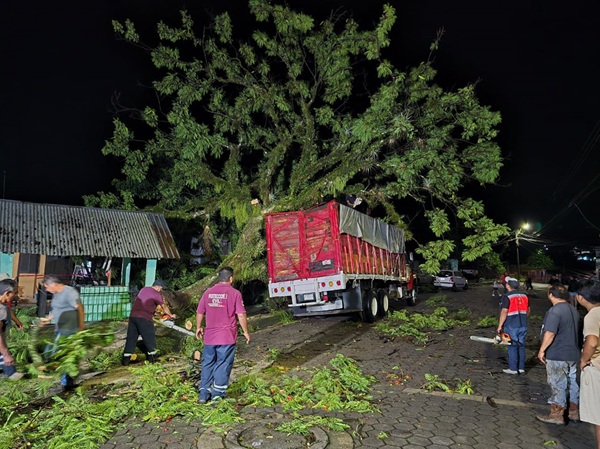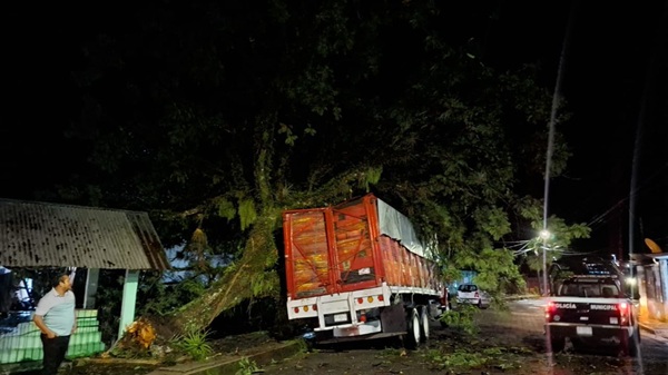 Las condiciones climáticas que se vienen presentando dentro de la presente temporada de lluvias, y el disturbio tropical 98L, provocó la caída de un árbol sobre un pesado camión, incidente que generó la activación de los elementos de la unidad de Protección Civil, quienes de manera inmediata brindaron atención al incidente.