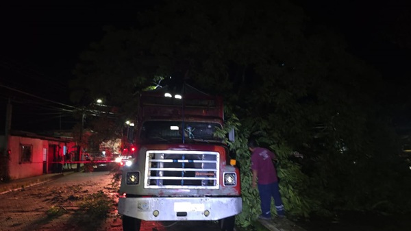 Los hechos se registraron la noche de este jueves sobre calle Francisco I. Madero de la colonia Lázaro Cárdenas, dónde un torrencial aguacero acompañado de rachas de vientos ocasionó la caída de un árbol de framboyán, quedando recostado encima de un pesado camión que se encontraba estacionado en la zona.