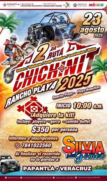 Este 23 de agosto de 2025 llega la 2da Ruta CHICHINIT – Rancho Playa, una experiencia todo terreno que no te puedes perder. Prepárate para recorrer senderos de arena, sol y selva a bordo de tu Razer, Tubular, Jeep, Buggy, Cuatrimoto o Moto