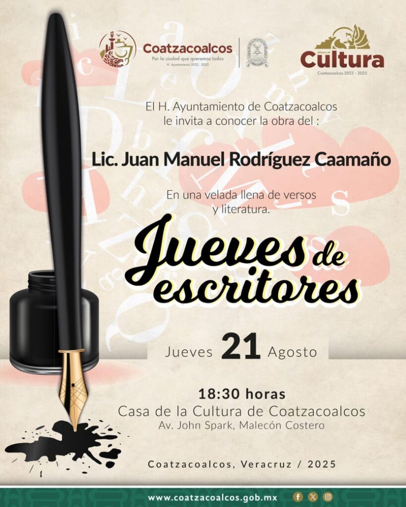 La cita es este jueves 21 de agosto, a las 18:30 horas, en la Casa de la Cultura de Coatzacoalcos, ubicada en la avenida John Spark, Malecón Costero.