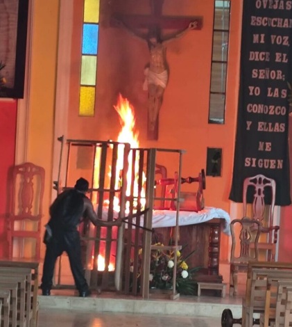 De acuerdo con los primeros informes, indican que el hecho se registró minutos después de las 17:00 horas de este jueves 21 de agosto, cuando el hombre irrumpió el templo con un machete para con el causar destrozos en el área del altar y posteriormente prenderle fuego a la cruz.