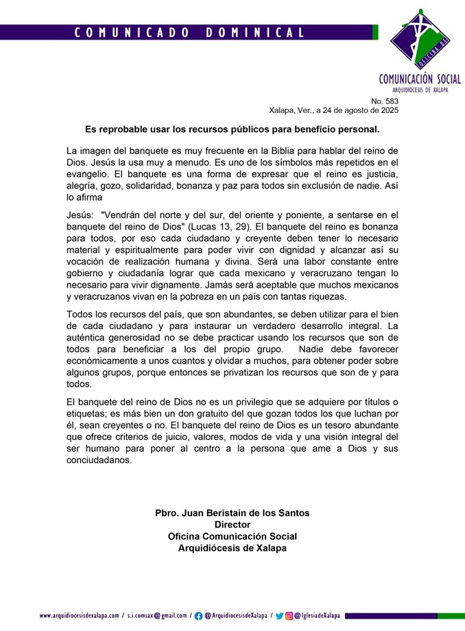 La Arquidiócesis de Xalapa reprobó el uso de los recursos públicos para beneficio personal, sino que todos los recursos del país, que son abundantes, se deben utilizar para el bien de cada ciudadano y para instaurar un verdadero desarrollo social.