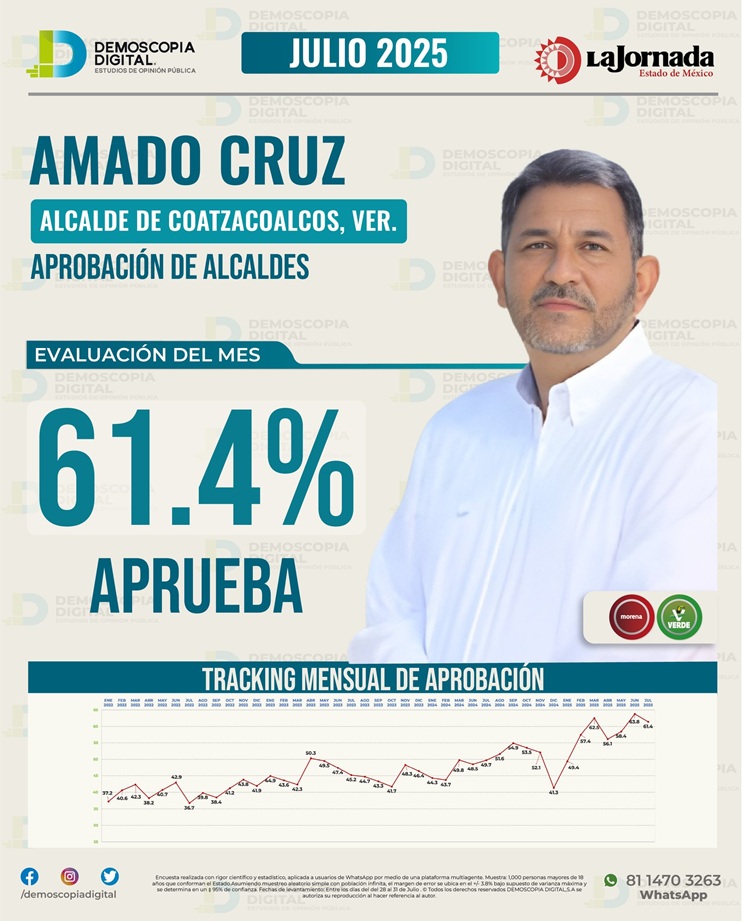 El presidente Municipal de Coatzacoalcos, Amado Jesús Cruz Malpica, cierra fuerte su gestión siendo el alcalde mejor posicionado del estado de Veracruz; así lo dieron a conocer la empresa Demoscopia Digital (que diseña y opera instrumentos de mercado y estudios políticos) en alianza con el periódico La Jornada de México, en su Estudio de Opinión Pública: “Ranking de Alcaldes, Aprobación del Mes de Julio 2025, Veracruz”.