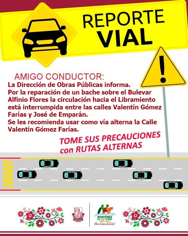 Por trabajos de bacheo y rehabilitación del concreto hidráulico en el bulevar Alfinio Flores Beltrán, autoridades municipales del Ayuntamiento que preside la alcaldesa Alfa Citlalli Álvarez Vázquez, el carril con dirección hacia el libramiento de la ciudad será restringido y lento para que los trabajos se agilicen.