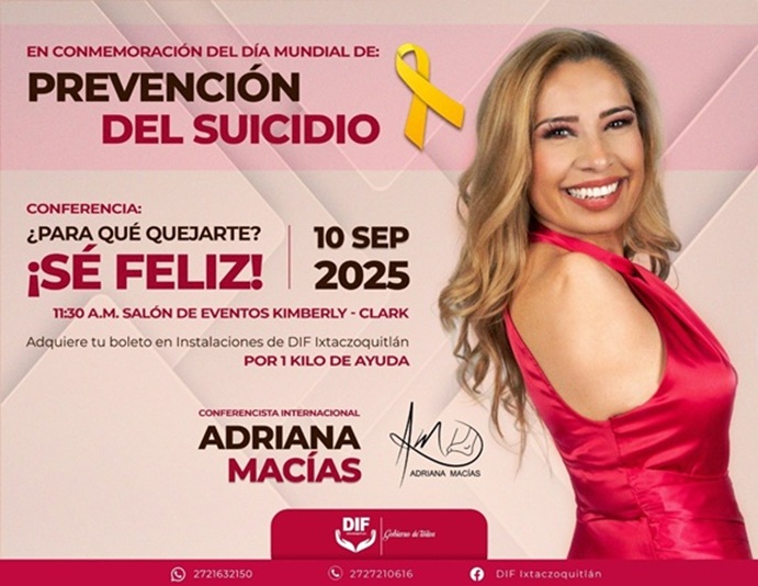 El próximo martes 10 de septiembre, la reconocida conferencista motivacional Adriana Macías se presentará en el municipio de Ixtaczoquitlán para impartir una plática inspiradora dirigida a la comunidad, en el Salón de eventos Kimberly Clark, a partir de las 11:30 de la mañana.