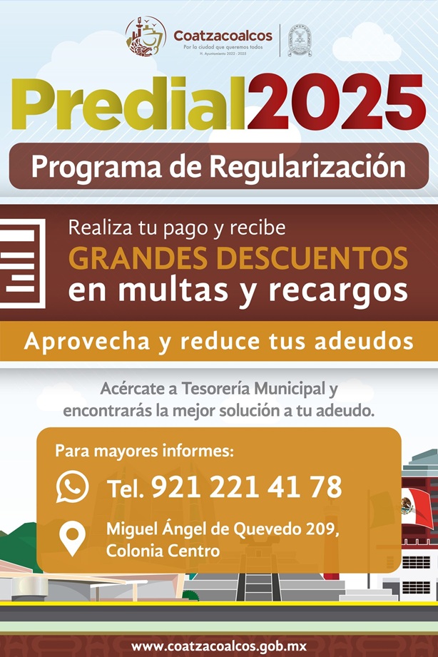 El Ayuntamiento de Coatzacoalcos, te invita a que aproveches el programa de regularización, realiza tu pago y recibe grandes descuentos en multas y recargos.