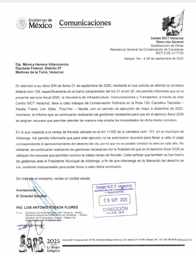 No obstante, la SICT aseguró que continuará gestionando lo necesario para que en 2026 se liberen los recursos y se logre la conclusión de este proyecto, considerado indispensable para la seguridad vial. Asimismo, se informó que ya se han iniciado gestiones ante el Ayuntamiento de Altotonga para intervenir en la liberación del derecho de vía.