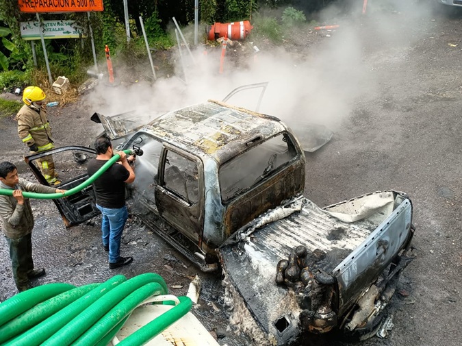Un calentamiento en el sistema eléctrico de una camioneta que circulaba sobre carretera federal Atzalan – Tlapacoyan, provocó que en cuestión de minutos fue envuelta por el fuego, ocasionando que el conductor y sus acompañantes lograron salir de la unidad para evitar quedar atrapados en el dantesco incendio.