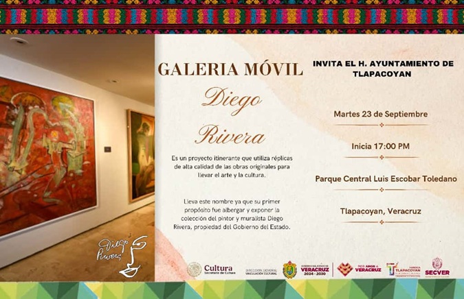 A partir de este martes 23 de septiembre, se encontrará instalada la galería Móvil con obras de Diego Rivera, como parte a la estrecha colaboración entre el gobierno municipal que emana Salvador Murrieta Moreno y la Secretaría de Cultura de Veracruz (SECVER), donde todas y todos los habitantes podrán ser parte de estas actividades.