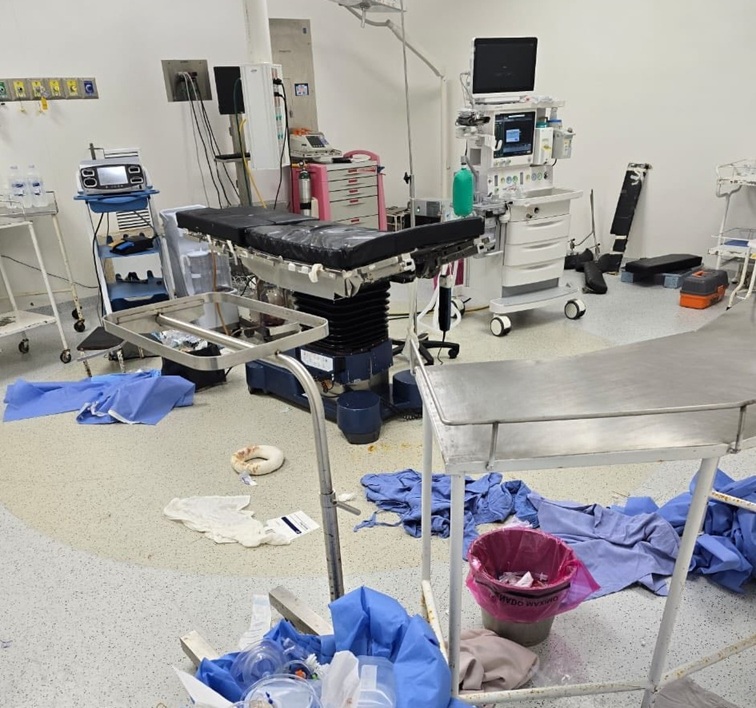 A través de imágenes que compartió el personal del nosocomio, se pueden ver las condiciones en las que se encuentran las instalaciones. Manchas de sangre y bolsas con ropa quirúrgica, yacen en el suelo.