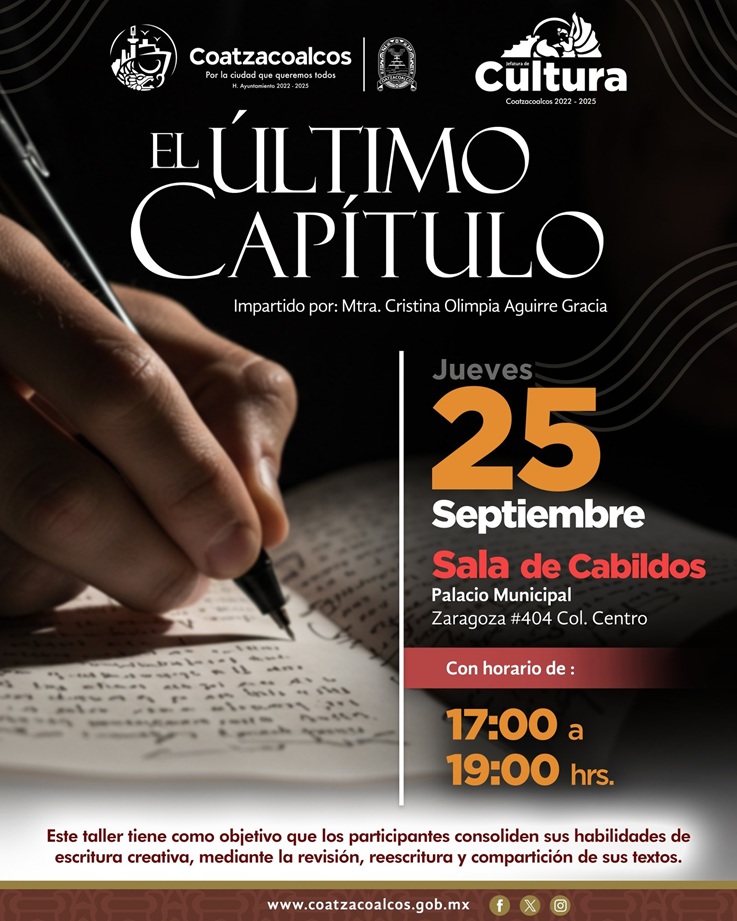 El Ayuntamiento de Coatzacoalcos invita al taller “El Último Capítulo” impartido por la Maestra Cristina Olimpia Aguirre García.