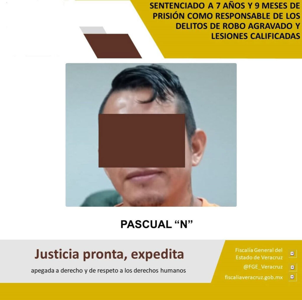 La Fiscalía Regional Xalapa logró sentencia condenatoria de 7 años y 9 meses de prisión en contra de Pascual “N” como responsable de los delitos de robo agravado y lesiones calificadas, cometido en agravio de la víctima E.D.R.