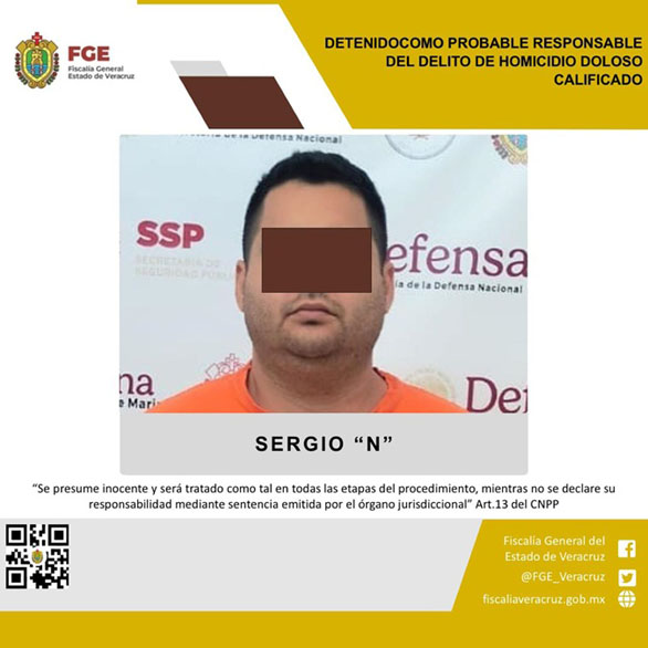 La Fiscalía General del Estado informa que, elementos de la Policía Ministerial adscritos a la Fiscalía Regional Xalapa, cumplimentaron una orden de aprehensión en contra de Sergio “N” como probable responsable del delito de homicidio doloso calificado, cometido en agravio de la víctima identificada con las iniciales J.S.L.