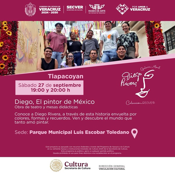 El ayuntamiento de Tlapacoyan, que preside Salvador Murrieta Moreno, en estrecha coordinación con la SECVER reiteran su invitación a toda la población de la región para visitar la Galería Móvil en el Parque municipal, sumando que el próximo sábado 27 de septiembre se presentarán obras teatrales “Diego el Pintor de México”.