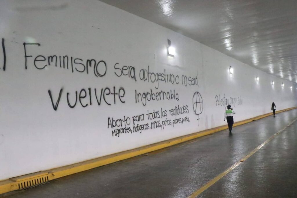 Las pintas realizadas en el Viaducto del Parque Juárez incluyeron frases como “Feminismo”, “Aborto Legal” y “Palestina, Congo y Sudán libres”, dañando con ello el enorme trabajo, tiempo y dedicación que se le ha invertido a renovar este icónico lugar de los xalapeños, que actualmente se mantiene cerrado por las noches a la circulación, para precisamente remozarlo y plasmar un mural que ilustre la importancia de todo lo acontecido en él.