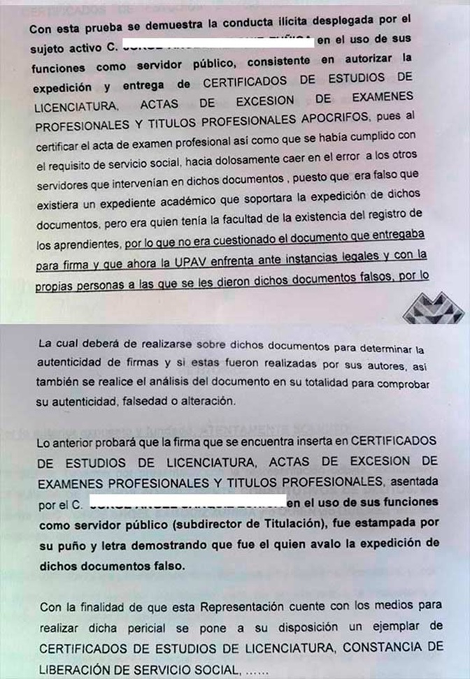 De acuerdo con la denuncia, interpuesta por el actual director de la UPAV, Sergio Torres Mejía, se tiene evidencia de que Jorge Ángel “N” firmó documentos a sabiendas de que carecían de validez. Según se explica, simuló que los alumnos habían cumplido con requisitos académicos como el servicio social, induciendo así al entonces rector, quien también firmó.
