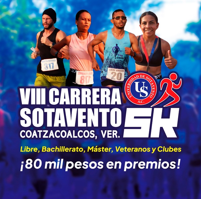 La Universidad de Sotavento (US) en coordinación con el Honorable Ayuntamiento de Coatzacoalcos y la Dirección Municipal del Deporte CONVOCA a la VIII Carrera Sotavento 2025, de 5 kilómetros, que se regirá bajo las siguientes BASES: