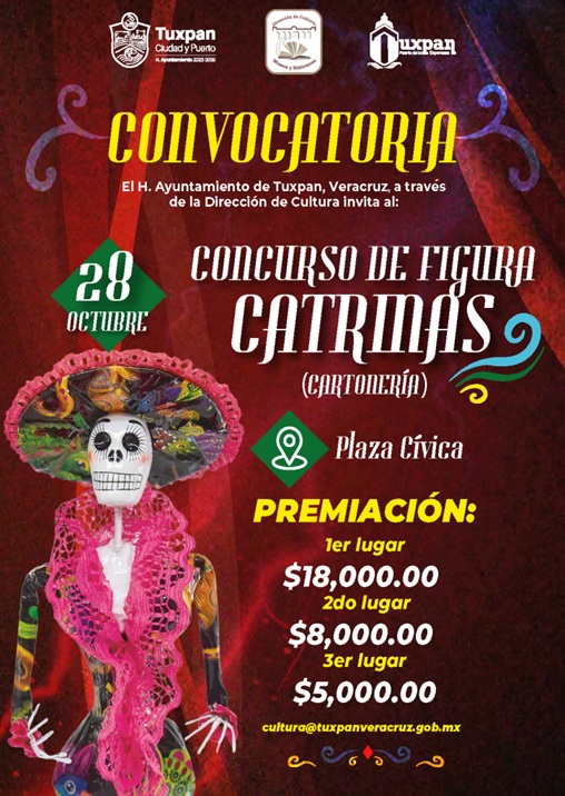 Hasta este lunes 6 de octubre estarán abiertas las inscripciones al “Concurso de Figura de Catrinas” (cartonería), que se realizará el próximo martes 28 de octubre en la Plaza Cívica, dentro de la festividad de Día de Muertos.