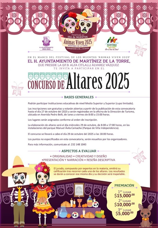 Por otro lado, el concurso de Altares va dirigido a instituciones educativas de nivel medio superior y superior con cupo limitado, por lo que quienes se registren deberán elaborar su altar el día 29 de octubre de 8 de la mañana a 5 de la tarde en el Parque Manuel Ávila Camacho de Villa Independencia, siendo las características a evaluar, originalidad, creatividad, diseño, reseña descriptiva, presentación y narración.