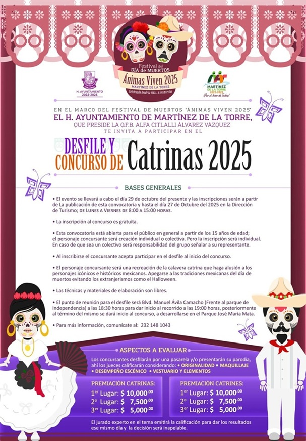 Como parte del Festival de Día de Muertos “Ánimas Viven 2025” el Gobierno que encabeza la Química Alfa Citlalli Álvarez Vázquez se prepara a través de la Dirección de Turismo, el Desfile y Concurso de Catrinas, con 3 atractivos premios para catrinas y 3 para catrines.
